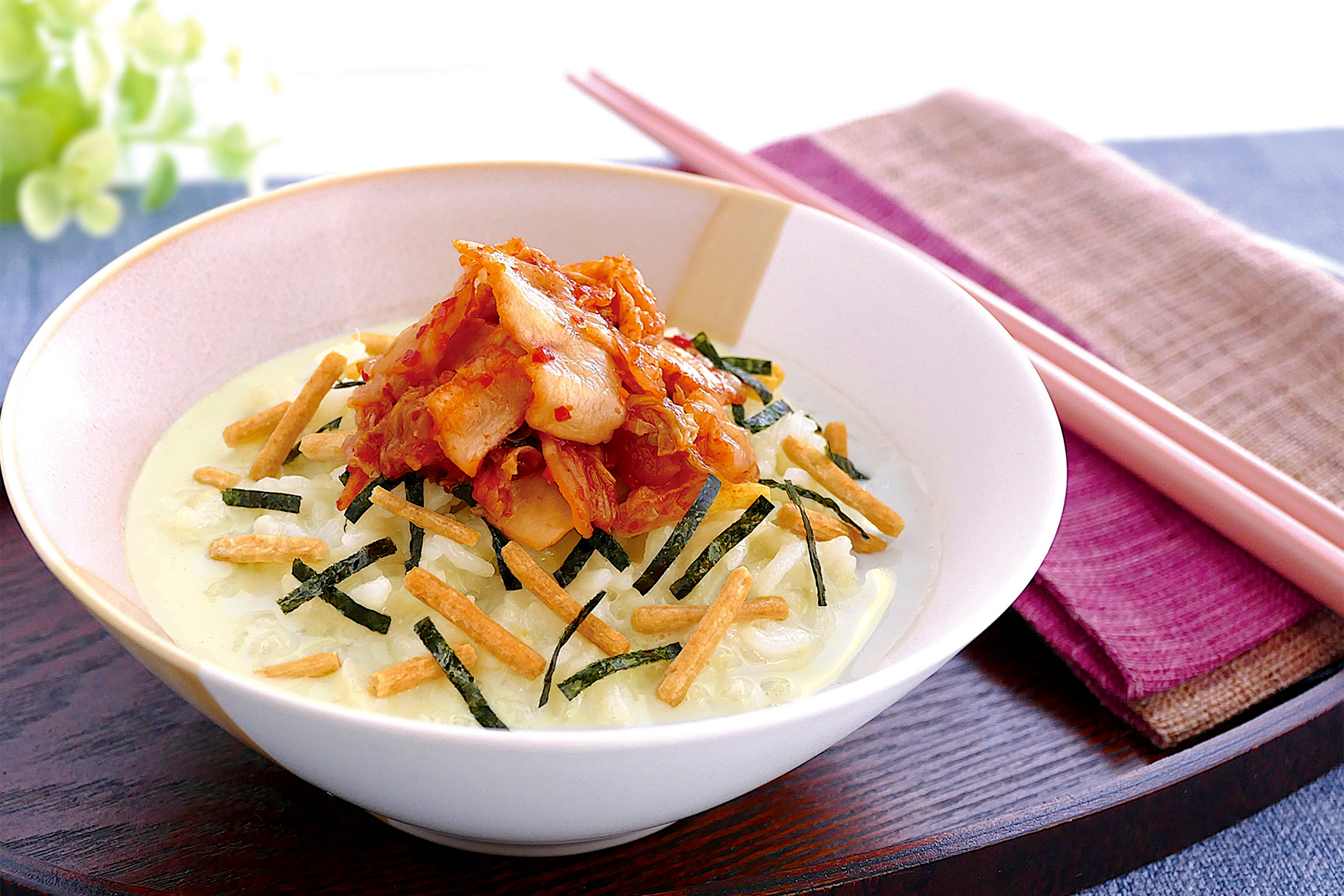 器にごはんを盛り、「お茶づけの素」をかけて、豆乳を注いでできあがり。