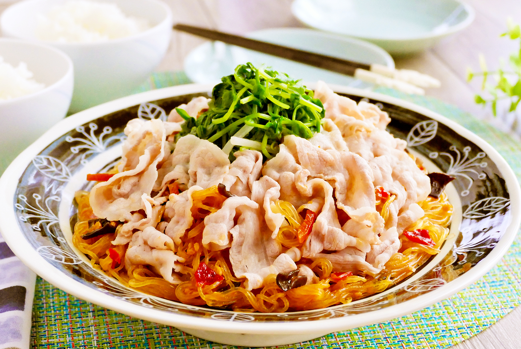 レンジで簡単!豆苗と豚肉の麻婆春雨