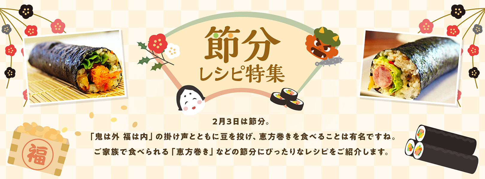 2月3日は節分。「鬼は外 福は内」の掛け声とともに豆を投げ、恵方巻きを食べることは有名ですね。ご家族で食べられる「恵方巻き」などの節分にぴったりなレシピをご紹介します。